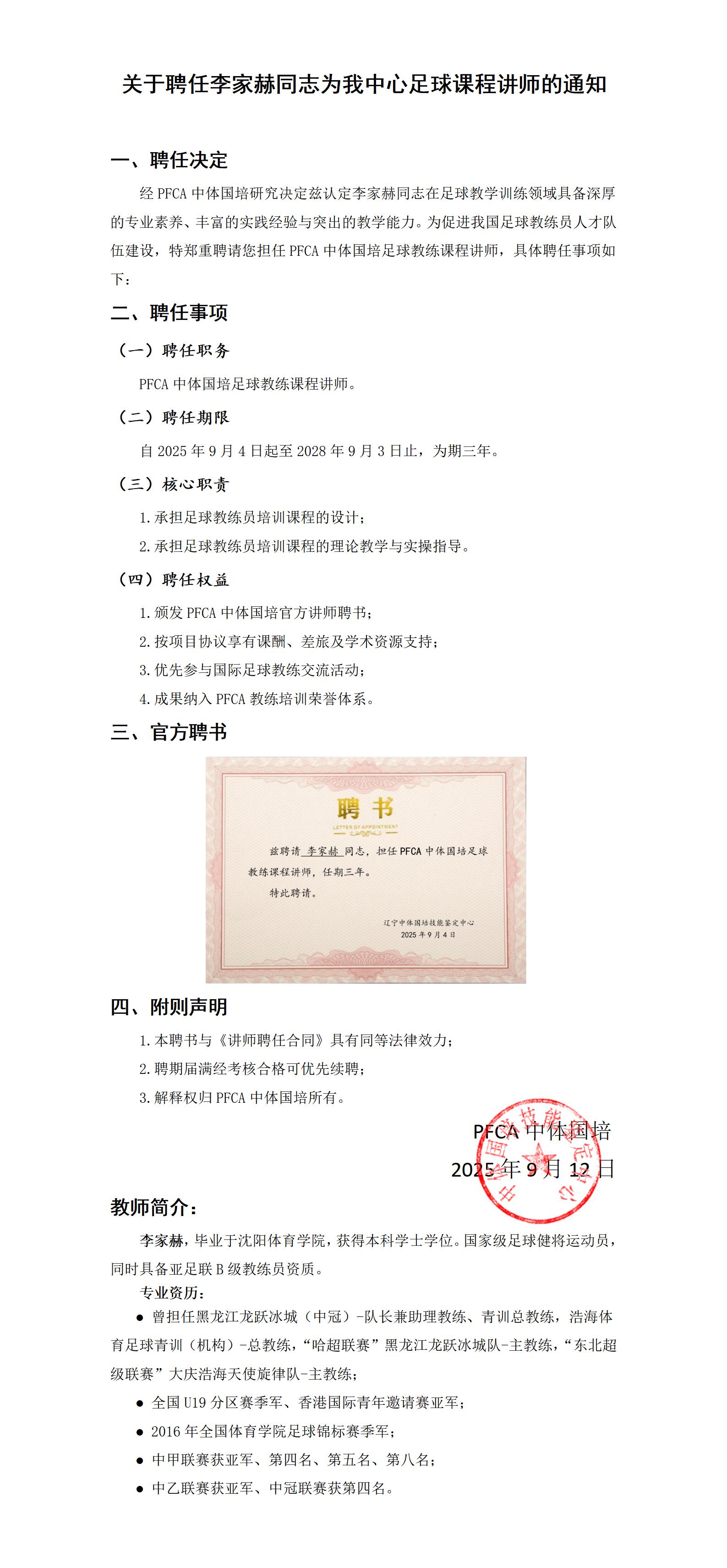 关于聘任李家赫同志为我中心足球课程讲师的通知