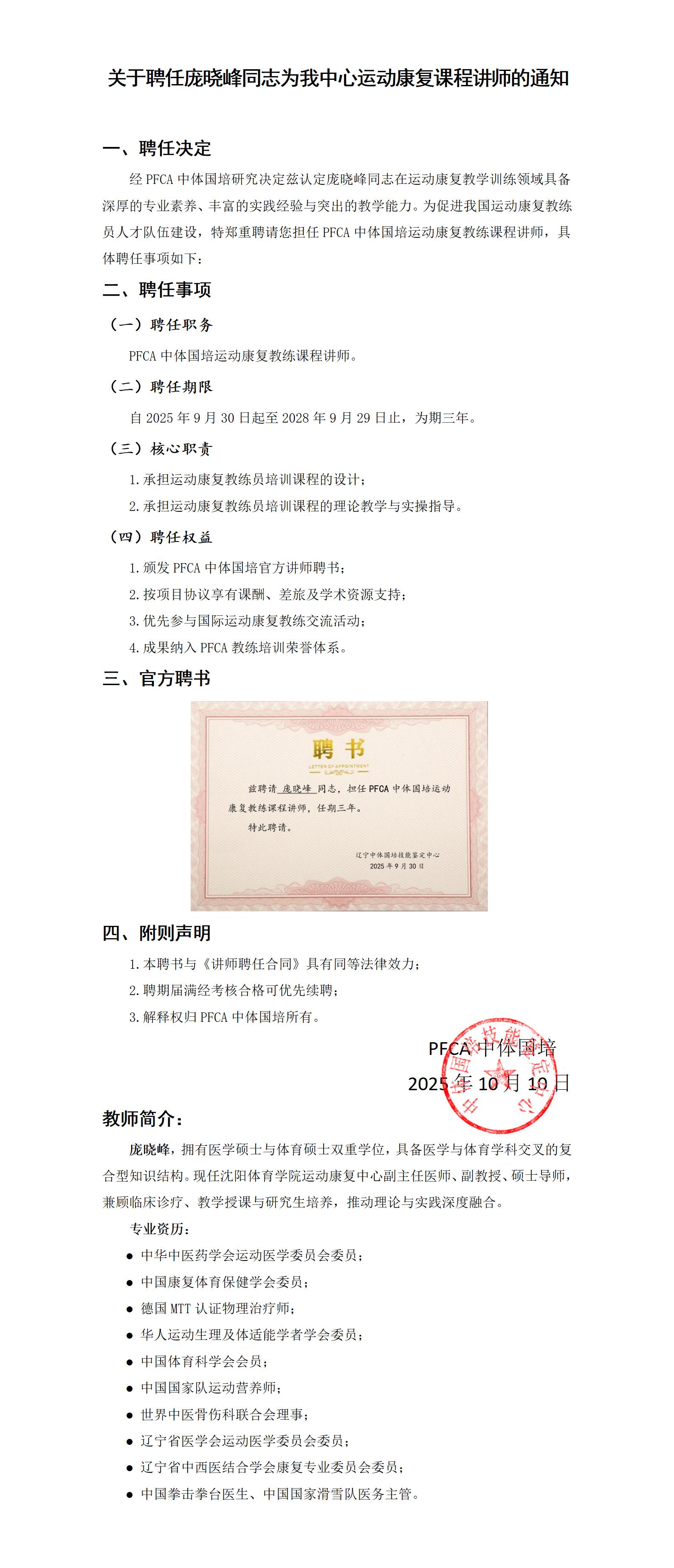 关于聘任庞晓峰同志为我中心运动康复课程讲师的通知